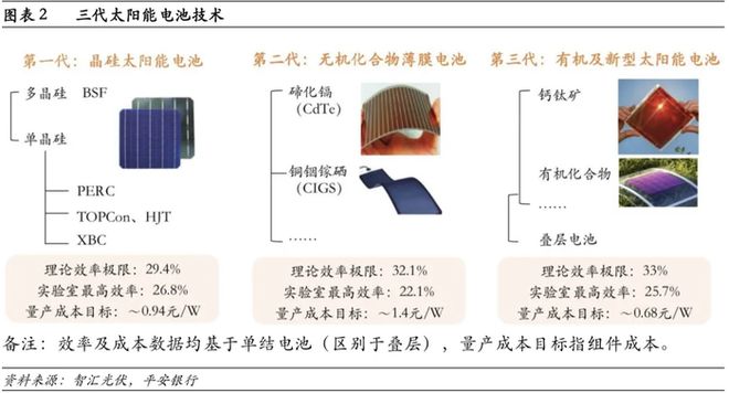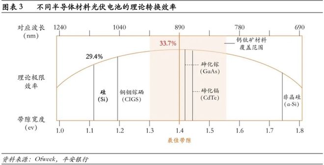 理论上,半导体的最佳带隙宽度应1.4ev,此时电池的理论极限效率可达33.7%;钙钛矿材料的带隙宽度区间正好包含了最佳带隙宽度,碲化镉等薄膜电池材料的禁带宽度相较硅材料也更接近最佳带隙宽度,因此第二代、第三代电池技术相比第一代晶硅电池具有更高的理论极限效率。此外,将不同半导体材料叠加制作叠层电池,可以扩大光子能量的吸收范围,使电池的理论极限效率进一步提升至40%以上,是光伏电池技术未来重要的发展方向。