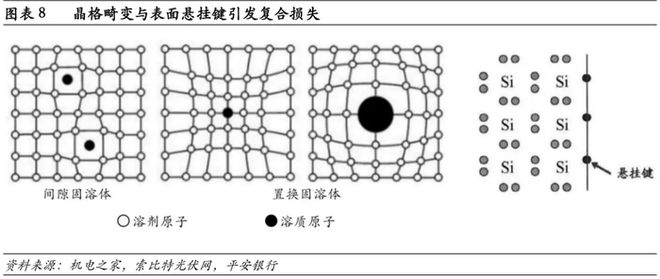 除此之外,由于硅片中的硼元素在光照或者电流的注入下,会与氧形成存在没有饱和化学键的硼氧复合体,该复合体会捕捉光照产生的载流子,降低少子寿命,造成光致衰减(LID)现象。目前产业界缓解P型硅片光衰的主要思路在于降低硼或氧含量,具体方法是使用高纯坩锅进行单晶生长,或是使用硼镓共掺降低硼含量,但是前者会增加硅片成本,后者会降低电池效率;而N型硅片由于硼含量极低,本身就可以有效减少光衰效应的发生。