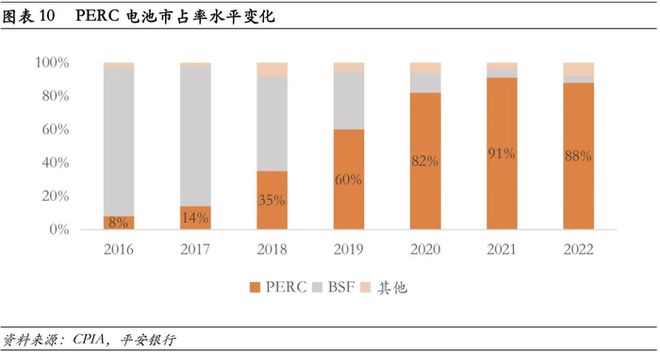 随着PERC电池技术的效率提升及量产工艺的逐步成熟,PERC电池市占率从2017年开始大约以每年20%左右的速度提升,直到2019年实现对BSF电池的反超,2021年市占率达到91%左右。