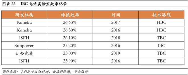 美国公司Sunpower是IBC电池的领军者和开拓者,其在2015年推出的第三代IBC电池已经可以实现25%的量产效率,分拆子公司Maxeon拟推出的第七代产品,结合了TOPCon电池的钝化接触结构,量产效率预计可达26%以上,相较同时期主流的PERC电池领先2-3个百分点,较TOPCon、HJT等N型电池技术也高出1个百分点左右。目前BC电池实验室效率最高记录为日本公司Kaneka于2017年采用HBC路线%;国内厂商方面,隆基绿能及爱旭股份均已实现量产,隆基绿能HPBC产品量产效率可达25.3%,爱旭股份ABC产品(路线暂未公开)量产效率可达26.5%。