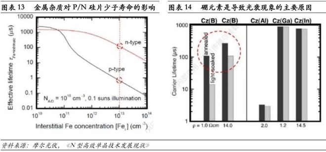 P、N型硅片的性能差异主要是由于,金属杂质Fe、Cu、Ni等一般带正电荷,对电子的捕获能力更强,P型硅片中少子为电子,N型硅片中少子为空穴,因此P型硅片相对N型硅片的抗污特性更弱,在相同杂质金属的情况下,N型硅片的少子寿命明显高于P型硅片(研究表明相同电阻率的N型硅片的少子寿命比P型硅片高出1-2个数量级);材料的少子寿命越高,光电转换效率越高,因此N型硅片具有更高的转换效率。