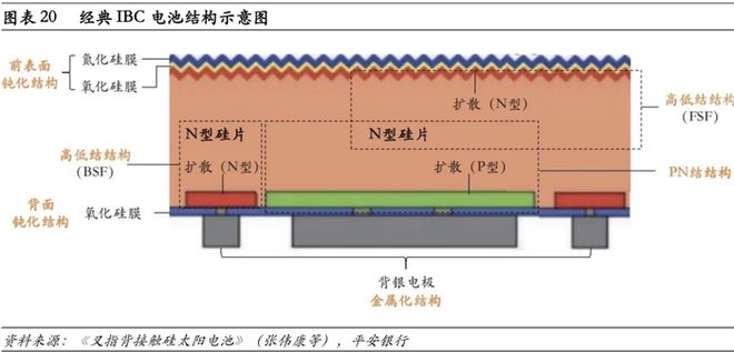 由于IBC电池采取了与TOPCon、HJT等完全不同的提效思路,不仅能够发挥自身的优势,还能与其他电池技术进行兼容,也被称作BC电池或XBC电池;理论上,BC结构可将电池的转换效率提升0.6-0.7%,因此作为一种具备高成长潜力的平台型技术,有望成为下一代主流技术路线)与TOPCon路线结合形成TBC电池:以N型硅片为衬底,前表面通过磷掺杂形成N+前表面场,沉积氧化铝+氮化硅作为钝化层和减反层;背面沉积隧穿氧化硅层,制作间隔排列的P型掺杂多晶硅层和N型掺杂多晶硅层,最后在其上沉积氮化硅钝化层,并对准P+和N+区域开孔并制作正负电极;隆基公司以P型硅片为基底研发的HPBC电池,在结构上吸收了IBC、PERC与TOPCon电池的特征,与TBC电池类似,主要区别在于将前表面的磷掺杂改为硼掺杂。