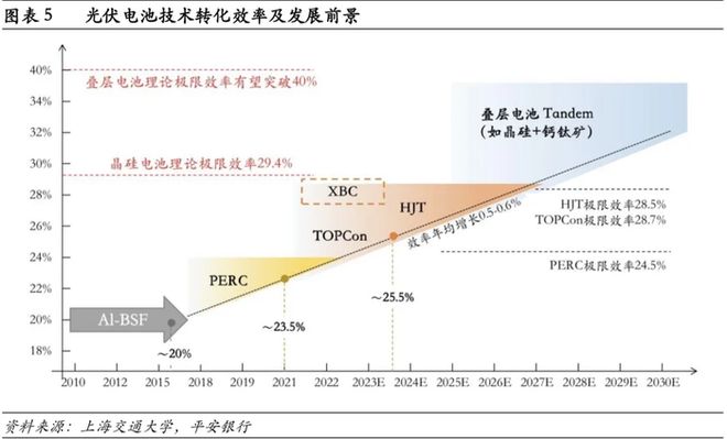 从最早实现商业化的铝背场电池(Al-BSF)到推动光伏平价上网的单晶PERC电池,提效思路主要在于优化钝化结构和电极接触方式,降低复合损失与欧姆损失。进入N型电池时代,TOPCon和HJT电池不约而同地选取了“钝化接触”技术进一步降低电学复合损失;BC电池则另辟蹊径,通过将前表面的电极移到背面,降低栅线遮挡,从而减少光学损失,而其作为一种平台型技术,还能够结合TOPCon和HJT的优势,形成效率更高的XBC电池路线。展望未来,钙钛矿等新型材料的研究突破,不仅有望带动新一代太阳电池的发展,也使晶硅电池能够与新材料相结合,向具有更高极限效率的叠层电池方向进行探索突破。