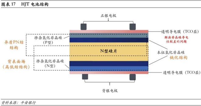 PERC和TOPCon电池都是在硅基体(c-Si)上通过掺杂直接形成PN结结构,即P型区域和P型区域都是在同种半导体上形成,称为同质结;而HJT电池的PN结是由N型硅片基底(c-Si)与掺杂的非晶硅薄膜(a-Si)两种半导体材料构成,因此被称作异质结电池。