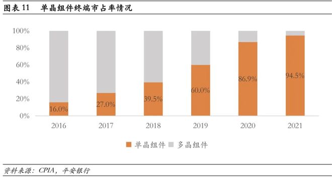 在同时期,光伏电池还经历了单晶与多晶的硅片材料之争。与多晶硅片相比,单晶硅片具有完整的晶格排列,内部缺陷和杂质更少,在电学性能、转换效率等方面都更具优势。自2015年下半年行业逐步攻克单晶组件CTM、光衰等问题后,终端单晶渗透率进入稳步上行通道。2019年,单晶组件市占率首次过半达到60%,2020年进一步提升至86.9%,基本成为市场主流;与此同时,多晶组件开始退出市场,2021年基本停止销售和公开报价。