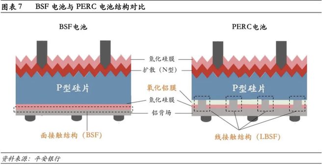 在PERC电池出现之前,铝背场电池(Aluminium Back Surface Field,Al-BSF)是最早实现产业化的晶硅电池结构,于1973年被首次提出,2016年时市占率超过90%。BSF电池具有工艺流程简单、成本低廉、技术成熟等诸多优点,但由于电池背面的铝背场和硅片衬底全面积接触,造成较为严重的表面复合损失,使得电池效率始终无法突破20%的瓶颈。