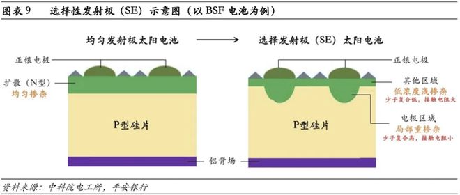 在电池的前表面,PERC电池还进一步采用选择性发射极(Selcvtive Emitter,SE)技术以降低电阻及复合损失。SE技术是指在金属电极与PN结N型区域接触的位置,通过更高浓度的磷掺杂,在局部形成由同种杂质浓度梯度构成的高低场(N+/N或P+/P),从而提高载流子的有效收集,并起到降低电阻的作用。但是,高浓度掺杂也容易造成更高的表面复合损失,因此仅在局部进行高浓度掺杂就可以很好地平衡金属与半导体接触时电阻损失与复合损失之间的矛盾。产业界于2017年前后逐步完成SE技术的叠加,推动PERC电池的转换效率提升至23.5%左右。