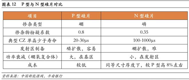 在硅片中掺入杂质可以制成P型硅片或N型硅片,二者主要的区别在于掺杂的元素不同:P型硅片中主要掺入硼或镓,少子为电子;N型硅片中主要掺入磷,少子为空穴。与P型硅片相比,以N型硅片为基底的太阳电池在性能方面有诸多优势,包括更高的少子寿命和杂质容忍度、无光致衰减现象、更低的温度系数等。