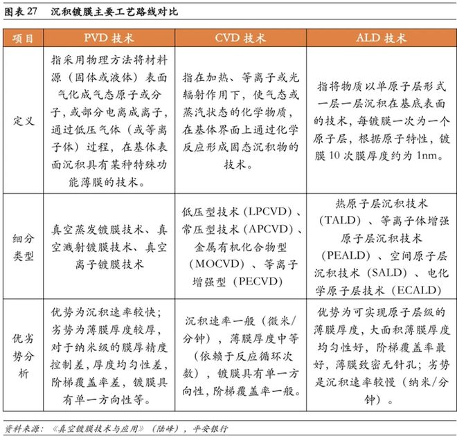 沉积镀膜工艺主要在真空气相中进行,按照原理不同可大致分为物理气相沉积(PVD)、化学气相沉积(CVD)和原子层沉积(ALD);其中,物理气相沉积是指将材料源直接气化为原子、分子或离子状态,通过低压过程沉积在基体表面;化学气相沉积是指通过化学反应过程,在基体表面生成沉积物;原子层沉积是指将物质以单原子层形式一层一层地沉积在基底表面。根据工艺环境、操作原理等方面的不同,三种模式还可以进一步细分为不同的工艺路线。