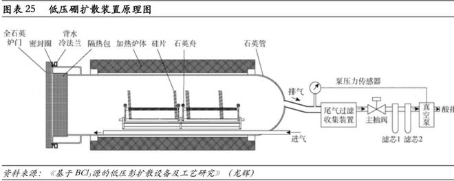 参考德国机械设备制造商协会(VDMA)发布的《2022年国际光伏技术路线图》(ITRPV),未来PECVD及原位掺杂技术的市占率有望逐步提升,到2032年,原位掺杂占比或将达到50%以上,PECVD占比或将达到60%。生产设备方面,LPCVD路线主要采用石英管装置,包括进出舟及控制系统(温度、流量、真空、压力)等结构;生产过程中首先通过热氧化法制备隧穿氧化层,再制备本征非晶硅层,最后使用扩散炉或离子注入设备完成磷掺杂。PECVD路线主要采用管式石墨舟装置,首先通过PECVD、PEALD或热氧化法制备隧穿氧化层,再制备非晶硅层并进行原位掺杂。