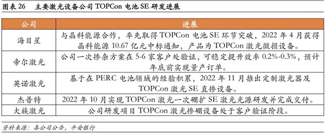 从终端电池厂商的选择来看,拉普拉斯的LPCVD路线具备先发优势,目前已在晶科、捷泰、通威、正泰、钧达等电池厂商实现应用;捷佳伟创的PECVD路线亦取得较快进步,已在天合、晶澳、通威等厂商实现应用;微导公司目前也已取得小范围供货;中来股份采用独特的POPAID路线,是TOPCon实验室最高效率(26.7%)保持者,设备由杰太供应。