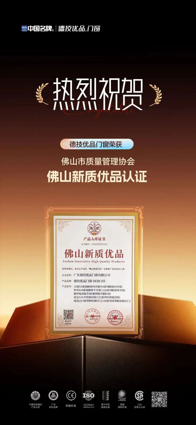 9月16日,中国名牌德技优品门窗凭借技术创新、品质管控与智能制造实力,通过评审入选“佛山新质优品”名库,获佛山市质量管理协会联合权威平台认证,彰显“佛山智造”高质量发展实力。“佛山新质优品”旨在遴选符合新质生产力方向、多维度突出的本土产品,获证者可入驻专属展厅全球推广,并获渠道与展销资源支持。