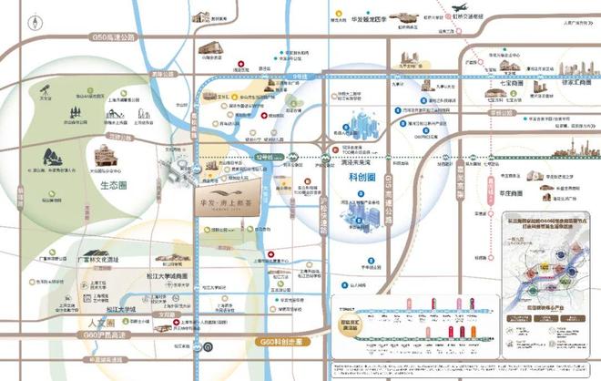 较近有明中广场,亚繁亚乐城、同乐生活广场。距离松江印象城、万达广场仅3公里左右,自驾10分钟内即可到达;另外在佘山站地铁上盖,规划有部分商业用地,洞泾未来湾沪松公路地铁站上盖还规划有大型的商业配套!